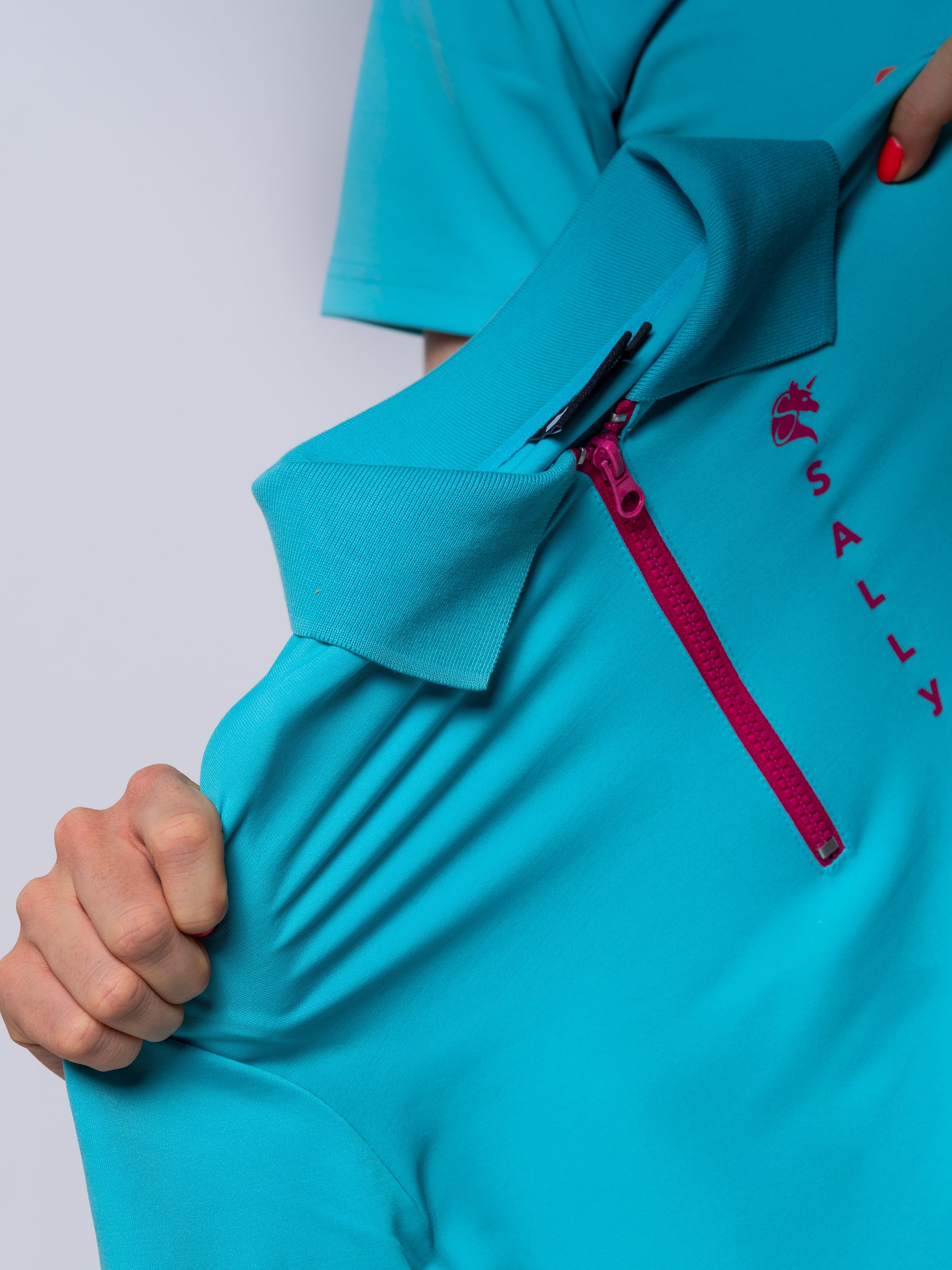 A póló kifinomult részletei tovább növelik a kényelmet és a funkcionalitást. A cipzáras gallér modern megjelenést kölcsönöz, miközben extra szellőzést biztosít, ha szükséged van rá. A lapos varrások megakadályozzák a dörzsölődést, így hosszabb edzéseken és versenyeken is maximális komfortot nyújt. Legyen szó terep-, díjlovas- vagy ugróedzésről, ez a póló tökéletes társad lesz minden kihívásban!